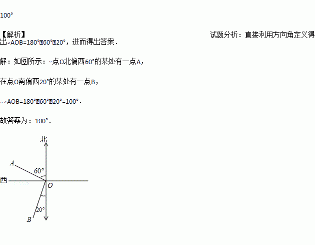在点O北偏西60°的某处有一点A,在点O南偏西20°的某处有一点B,则∠AOB的度数是_____________