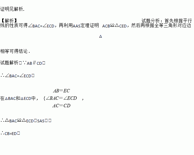 如图,E、A、C三点共线,BC=ED,AB=CE,AC=CD.求证:∠B=∠E