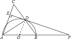 分析:(1)连结OD,AB为⊙0的直径得∠ADB=90°,由AB=AC,根据等腰三角形性质得AD平分BC,即DB=DC,则OD为△ABC的中位线,所以OD∥AC,而DE⊥AC,则OD⊥DE,然后根据切线的判定方法即可得到结论;
