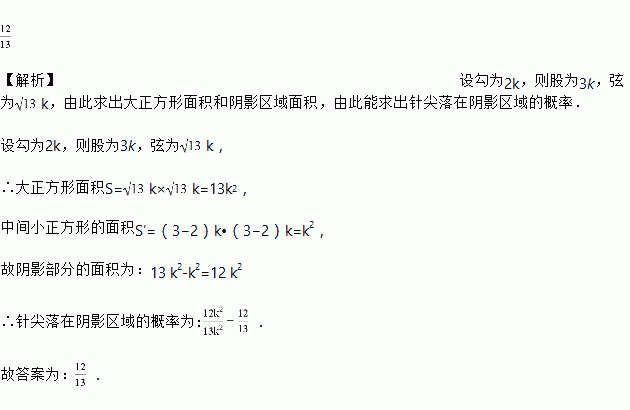汉代数学家赵爽在注解《周髀算经》时给出的“赵爽弦图”是我国古代数学的瑰宝.如图所示的弦图中,四个直角三角形都是全等的,它们的两直角边之比均为,现随机向该图形内掷一枚小针,则针尖落在阴影区域的概率为__________.![]()