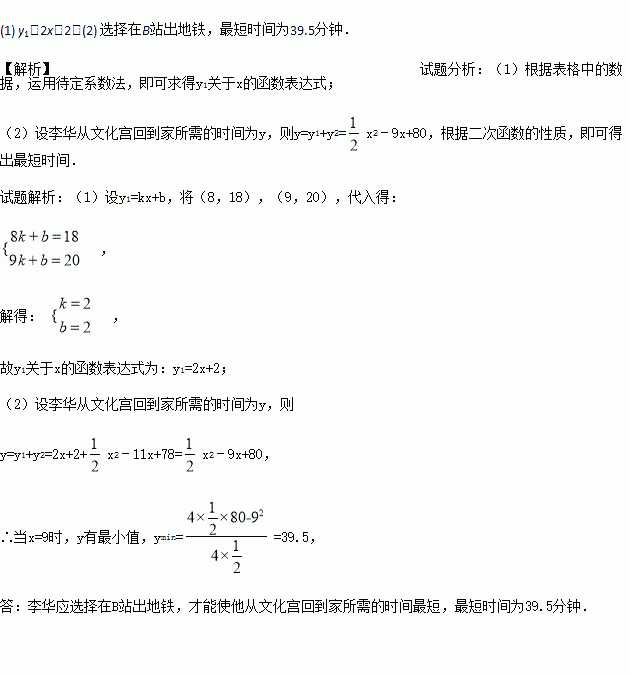 x2-11x+78来描述,请问:李华应选择在哪一站出地铁,才能使他从文化宫回到家所需的时间最短?并求出最短时间.