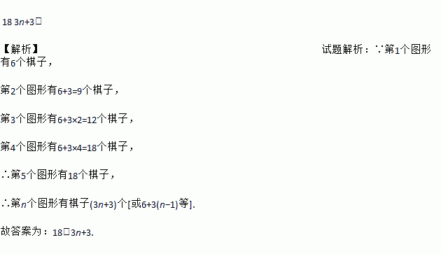 18 3n+3. 【解析】试题解析:∵第1个图形有6个棋子, 第2个图形有6+3=9个棋子, 第3个图形有6+3×2=12个棋子, 第4个图形有6+3×4=18个棋子, ∴第5个图形有18个棋子, ∴第n个图形有棋子(3n+3)个[或6+3(n?1)等]. 故答案为:18,3n+3.
