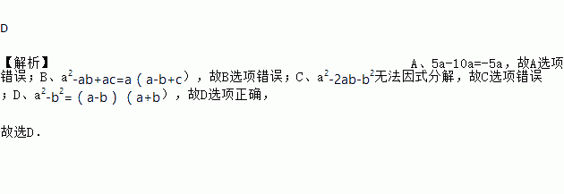 D 【解析】A、5a-10a=-5a,故A选项错误;B、a2-ab+ac=a(a-b+c),故B选项错误;C、a2-2ab-b2无法因式分解,故C选项错误;D、a2-b2=(a-b)(a+b),故D选项正确, 故选D.