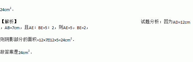 如图,在矩形ABCD中,点E、F分别在AB、DC上,BF∥DE,若AD=12cm,AB=7cm,且AE:EB=5:2,则阴影部分的面积为_______