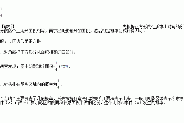 在如图所示的正方形纸片上做随机扎针实验,则针头扎在阴影区域内的概率为_______.