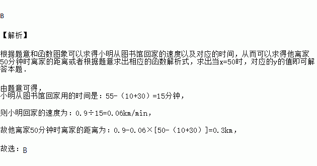 小聪从家到书店买书后返回,他离家的距离与离家的时间分钟之间的对应关系如图所示,若小聪在书店买书30分钟,则他离家50分钟时离家的距离为