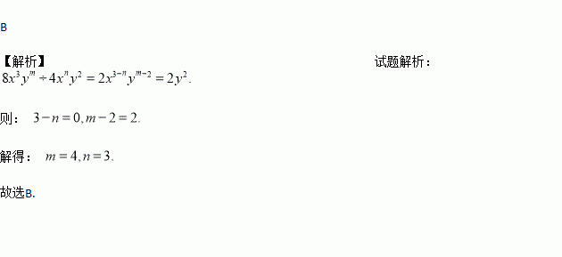 若8x3ym÷4xny2=2y2,则m,n的值为( )