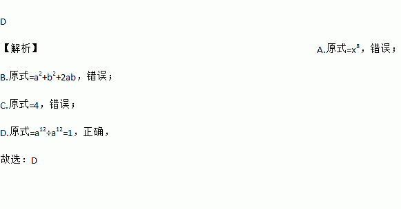 A. x4·x4=x16 B. (a+b)2=a2+b2 C. =±4 D. (a6)2÷(a4)3=1