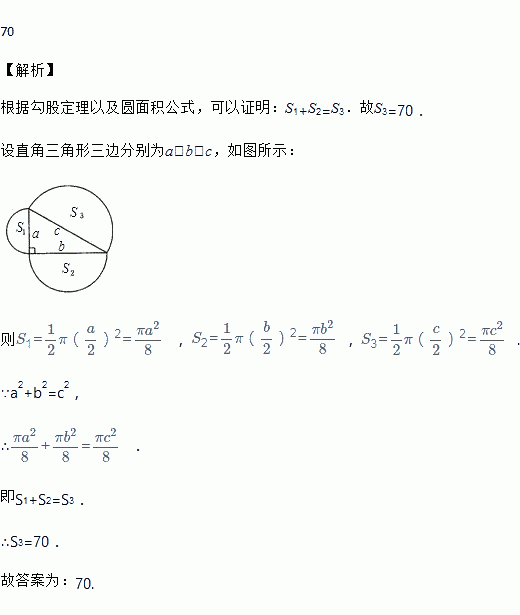 如图,分别以直角三角形三边向外作三个半圆,若S1=30,S2=40,则S3=_____.