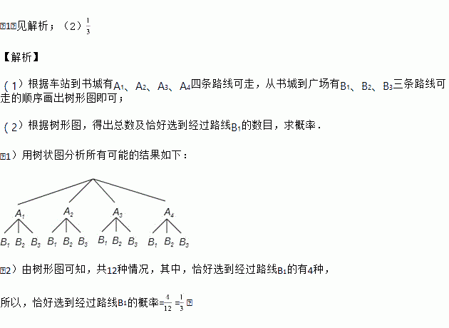 从车站到书城有A1、A2、A3、A4四条路线可走,从书城到广场有B1、B2、B3三条路线可走,现让你随机选择一条从车站出发经过书城到达广场的行走路线.
