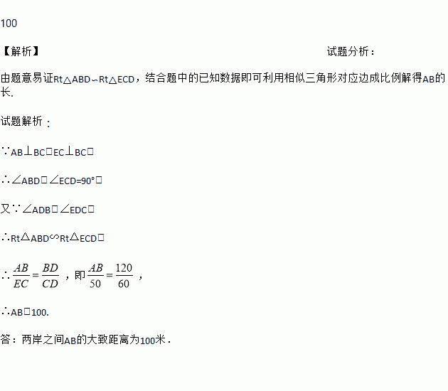 为了估算河的宽度,我们可以在河对岸的岸边选定一个目标作为点A,再在河的这一边选点B和点C,使AB⊥BC,然后再选点E,使EC⊥BC,确定BC与AE的交点为D,如图.测得BD=120米,DC=60米,EC=50米,你能求出两岸之间AB的大致距离吗?