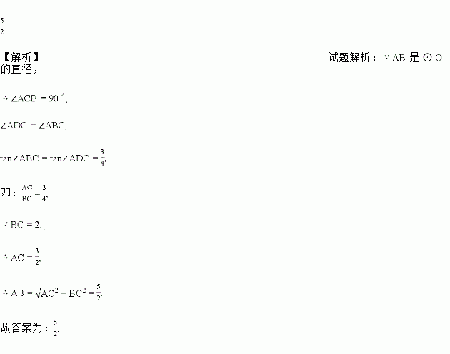 如图,AB是⊙O的直径,C、D是圆上的两点(不与A、B重合),已知BC=2,tan∠ADC=,则AB=_____.