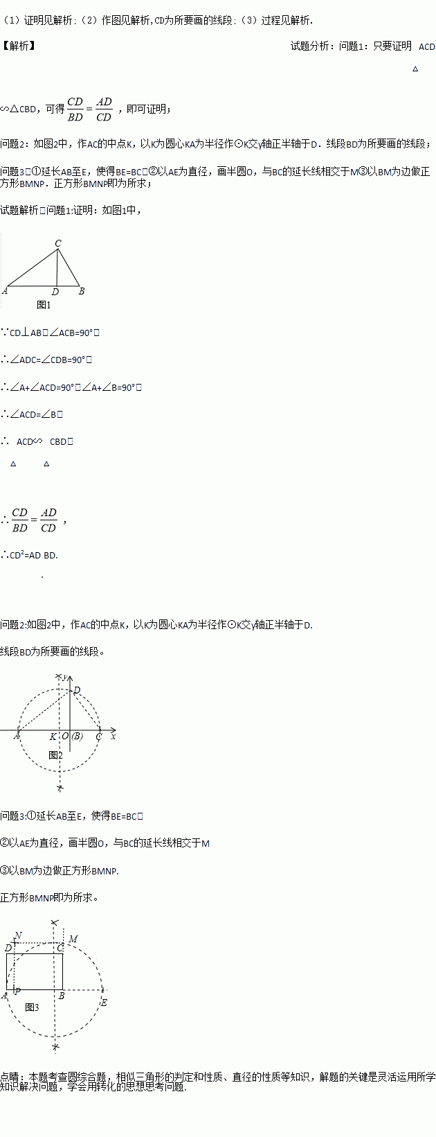 问题2:已知两条线段AB、BC在x轴上,如图2:请你用直尺(无刻度)和圆规作出这两条线段的比例中项.要求保留作图痕迹,不要写作法,最后指出所要作的线段.