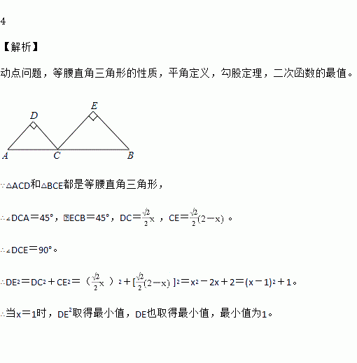 如图,线段AB的长为2,C为AB上一个动点,分别以AC、BC为斜边在AB的同侧作两个等腰直角三角形△ACD和△BCE,那么DE长的最小值是______________.