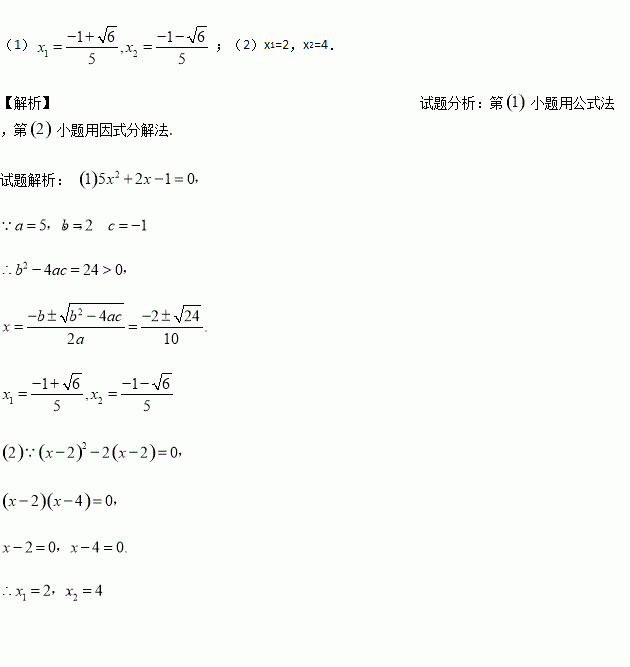 (1)5x2+2x﹣1=0;(2)(x﹣2)2=2x﹣4.