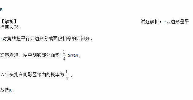 如图所示,在平行四边形纸片上作随机扎针实验,针头扎在阴影区域内的概率为( )