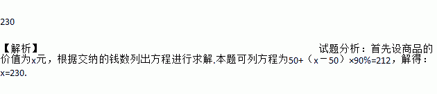 230 【解析】试题分析:首先设商品的价值为x元,根据交纳的钱数列出方程进行求解.本题可列方程为50+(x-50)×90%=212,解得:x=230.