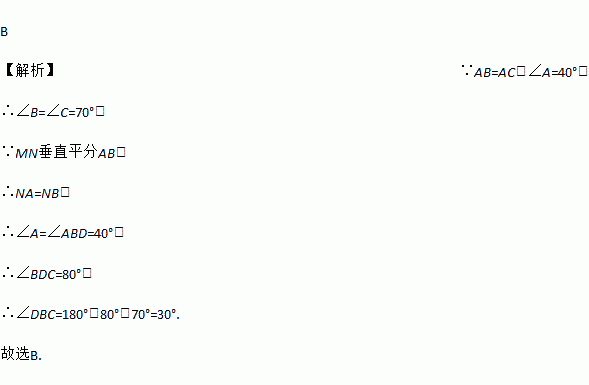 B 【解析】∵AB=AC,∠A=40°, ∴∠B=∠C=70°, ∵MN垂直平分AB, ∴NA=NB, ∴∠A=∠ABD=40°, ∴∠BDC=80°, ∴∠DBC=180°-80°-70°=30°. 故选B.