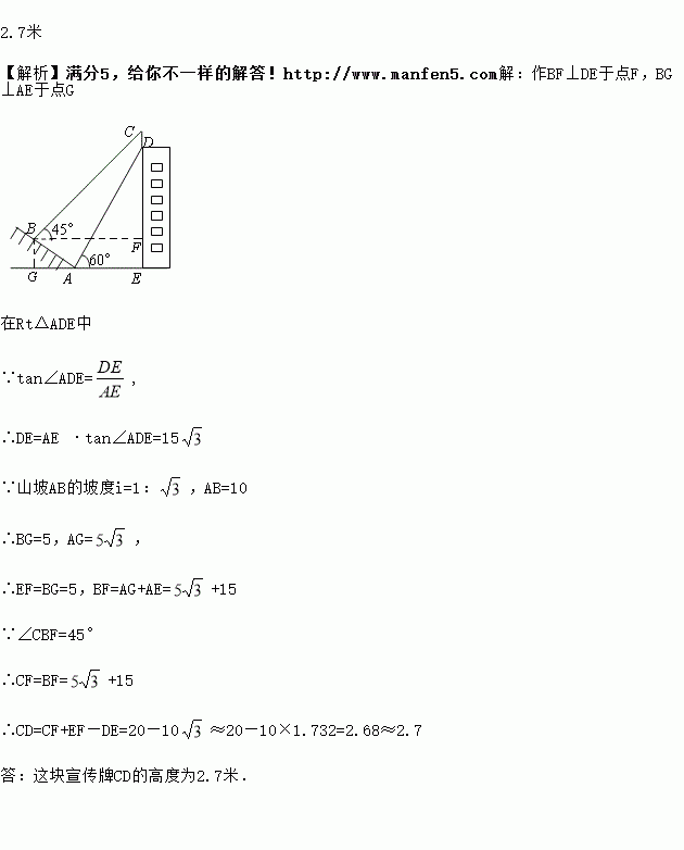 如图,某校一幢教学大楼的顶部竖有一块“传承文明,启智求真”的宣传牌CD.小明在山坡的坡脚A处测得宣传牌底部D的仰角为60°,沿山坡向上走到B处测得宣传牌顶部C的仰角为45°.已知山坡AB的坡度i=1:,AB=10米,AE=15米,求这块宣传牌CD的高度.(测角器的高度忽略不计,结果精确到0.1米.参考数据:≈1.414,≈1.732)