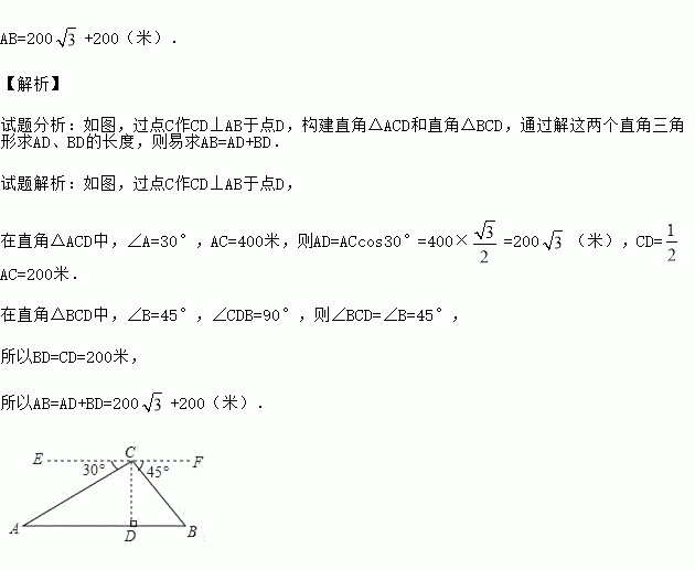如图,从热气球C处测得地面A,B两点的俯角分别为30°,45°,此时热气球C处所在位置到地面上点A的距离为400米.求地面上A,B两点间的距离.