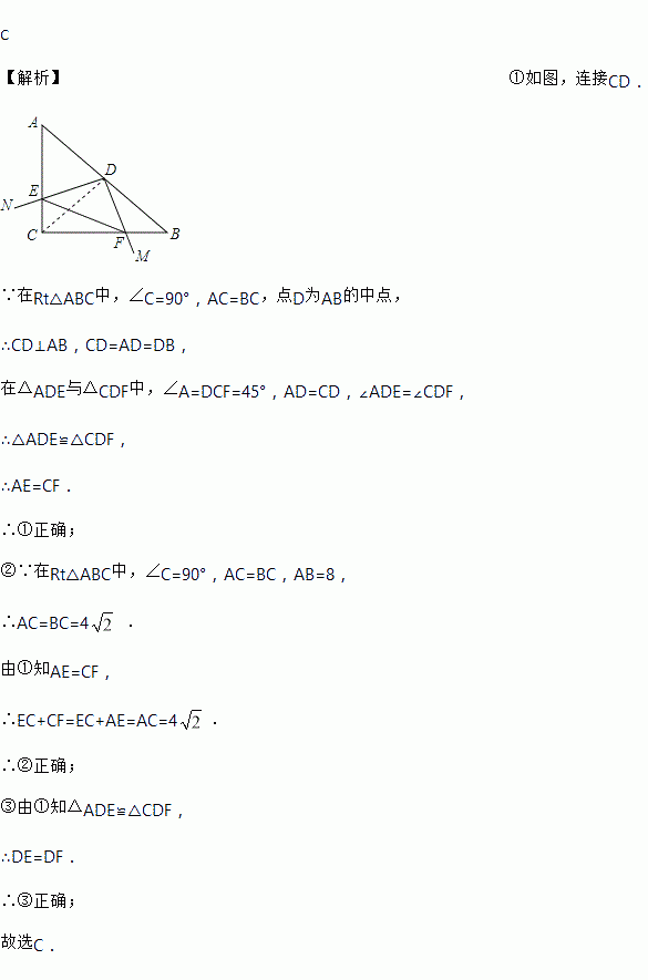 C 【解析】①如图,连接CD. ∵在Rt△ABC中,∠C=90°,AC=BC,点D为AB的中点, ∴CD⊥AB,CD=AD=DB, 在△ADE与△CDF中,∠A=DCF=45°,AD=CD,∠ADE=∠CDF, ∴△ADE≌△CDF, ∴AE=CF. ∴①正确; ②∵在Rt△ABC中,∠C=90°,AC=BC,AB=8, ∴AC=BC=4 . ...