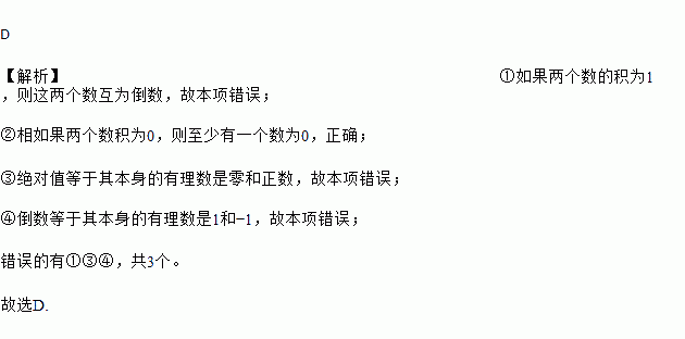 D 【解析】①如果两个数的积为1,则这两个数互为倒数,故本项错误; ②相如果两个数积为0,则至少有一个数为0,正确; ③绝对值等于其本身的有理数是零和正数,故本项错误; ④倒数等于其本身的有理数是1和?1,故本项错误; 错误的有①③④,共3个。 故选D.