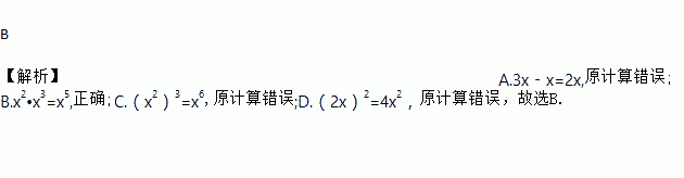 A. 3x﹣x=3 B. x2•x3=x5 C. (x2)3=x5 D. (2x)2=2x2