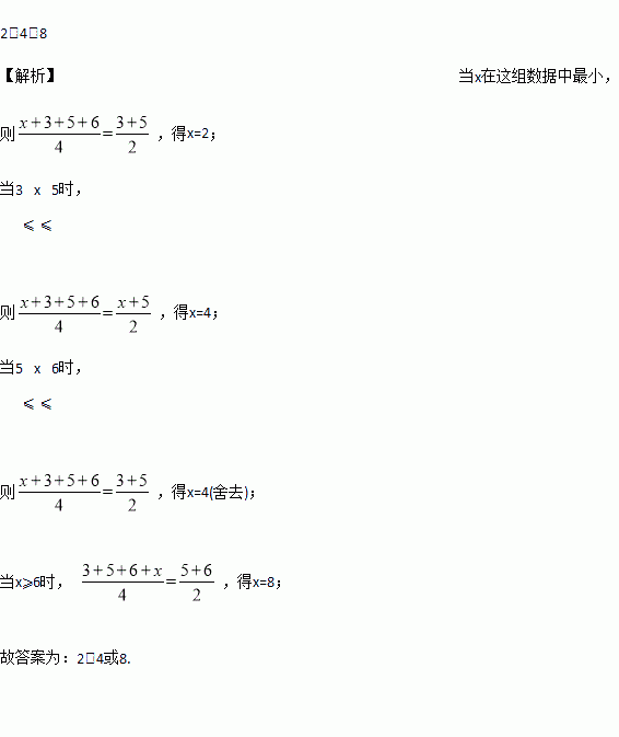 一组数据:3,5,6,x中,若中位数与平均数相等,则x=________