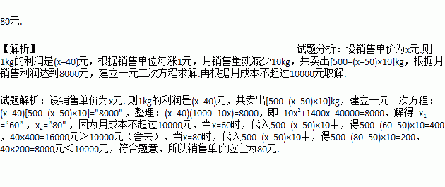 某超市经销一种成本为40元/kg的水产品,市场调查发现,按50元/kg销售,一个月能售出500kg,销售单位每涨1元,月销售量就减少10kg,针对这种水产品的销售情况,超市在月成本不超过10000元的情况下,使得月销售利润达到8000元,销售单价应定为多少?