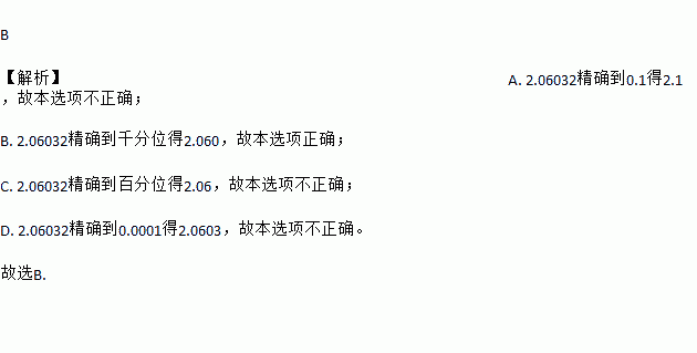 B 【解析】A. 2.06032精确到0.1得2.1,故本选项不正确; B. 2.06032精确到千分位得2.060,故本选项正确; C. 2.06032精确到百分位得2.06,故本选项不正确; D. 2.06032精确到0.0001得2.0603,故本选项不正确。 故选B.