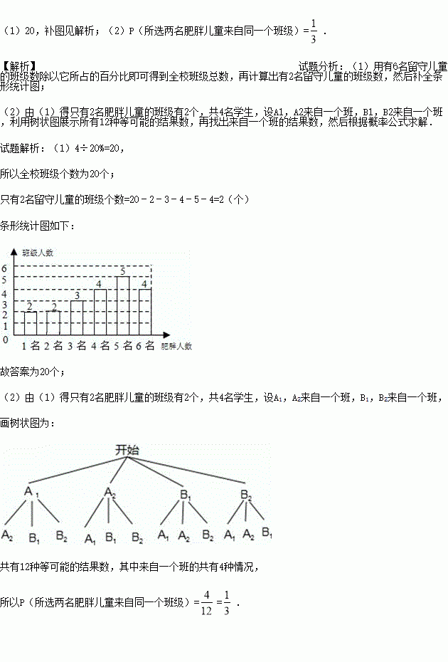 (2)为了了解肥胖儿重的饮食情况,某校决定从只有2名留守儿童的这些班级中,任选两名进行调查,请用列表法或画树形图的方法,求出所选两名肥胖儿童来自同一个班级的概率.