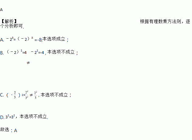 A. ﹣23=(﹣2)3 B. (﹣2)2=﹣22 C. (﹣)2= D. 32=3×2