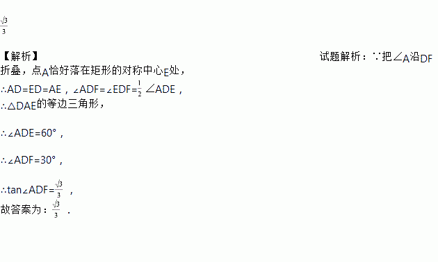 如图,在矩形ABCD中,把∠A沿DF折叠,点A恰好落在矩形的对称中心E处,则tan∠ADF=_______.