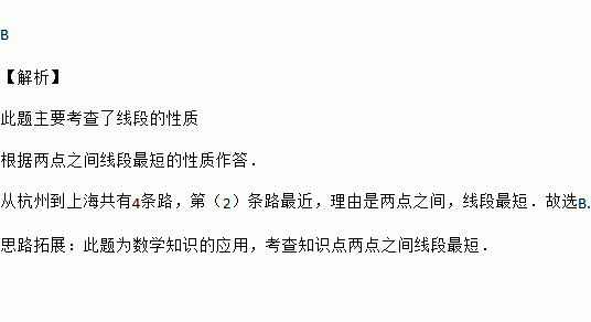 杭州到上海有条路可以走(如图所示),则其中最近的一条路线的序号是( )