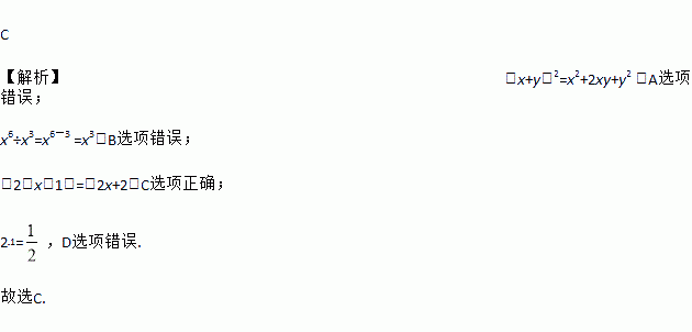 C 【解析】(x+y)2=x2+2xy+y2,A选项错误; x6÷x3=x6-3 =x3,B选项错误; -2(x-1)=-2x+2,C选项正确; 2﹣1=,D选项错误. 故选C.