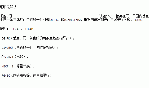 如图,已知:CF⊥AB于F,ED⊥AB于D,∠1=∠2,求证:FG∥BC.
