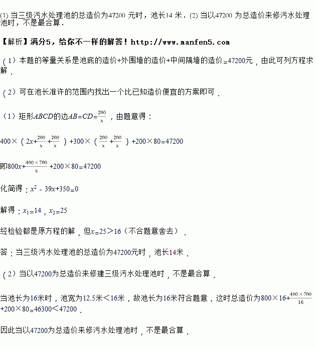 ij¹¤³§Ä⽨һ×ùÆ½ÃæÍ¼ÐÎΪ¾ØÐÎÇÒÃæ»ýΪƽ·½Ã×µÄÈý¼¶ÎÛË®´¦Àí³Ø£¨Æ½ÃæÍ¼Èçͼ![]()