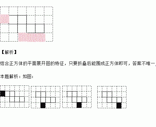 马小虎准备制作一个封闭的正方体盒子,他先用5个大小一样的正方形制成如图所示的拼接图形(实线部分),经折叠后发现还少一个面,请你在图中的拼接图形上再接一个正方形,使新拼接成的图形经过折叠后能成为一个封闭的正方体盒子(添加所有符合要求的正方形,添加的正方形用阴影表示)_____.