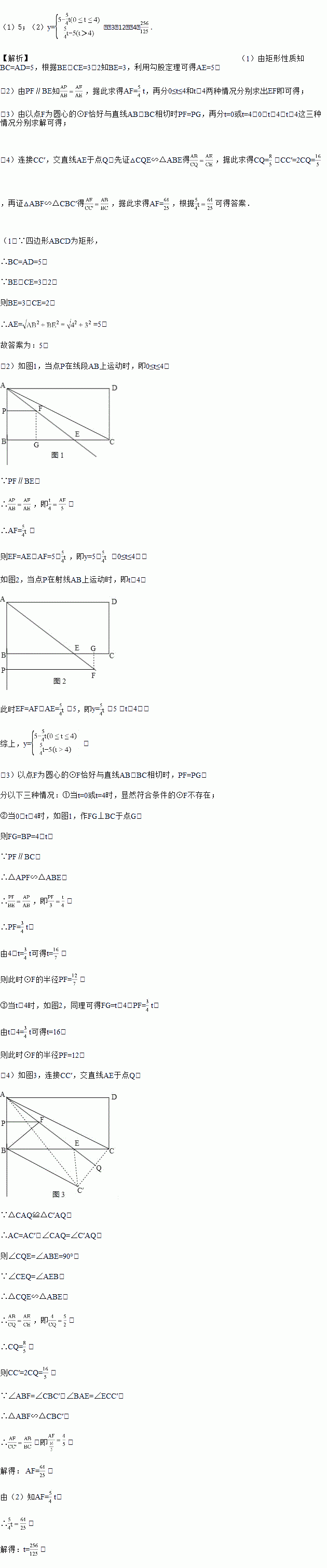 如图1,矩形ABCD中,AB=4,AD=5,E为BC上一点,BE:CE=3:2,连接AE,点P从点A出发,沿射线AB的方向以每秒1个单位长度的速度匀速运动,过点P作PF∥BC交直线AE于点F.