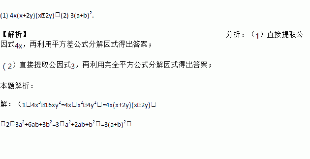 (1) 4x(x+2y)(x﹣2y);(2) 3(a+b)2. 【解析】分析:(1)直接提取公因式4x,再利用平方差公式分解因式得出答案; (2)直接提取公因式3,再利用完全平方公式分解因式得出答案; 本题解析: 【解析】 (1)4x3﹣16xy2=4x(x2﹣4y2)=4x(x+2y)(x﹣2y); (2)3a2+6ab+3b2=3(a2+2ab+b2)=3(a+...