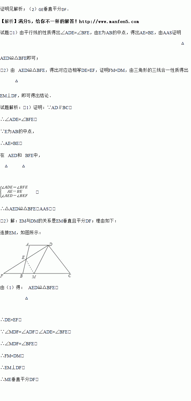 如图,在四边形ABCD中,AD∥BC,E是AB的中点,连接DE并延长交CB的延长线于点F,点M在BC边上,且∠MDF=∠ADF.