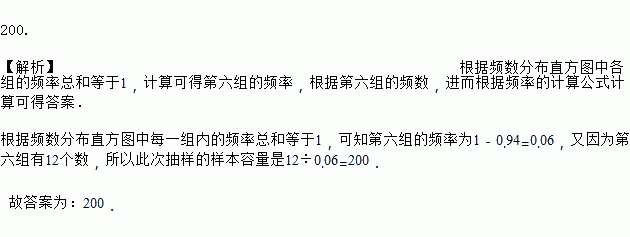 如图是某市晚报记者在抽样调查了一些市民用于读书、读报、参加“全民健身运动”等休闲娱乐活动的时间后,绘制的频数分布直方图(共六组),已知从左往右前五组的频率之和为0.94,如果第六组有12个数,则此次抽样的样本容量是_____
