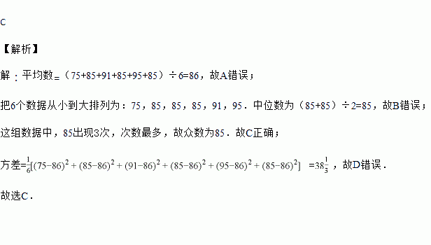在一次中学生汉字听写大赛中,某中学代表队6名同学的笔试成绩分别为:75,85,91,85,95,85.关于这6名学生成绩,下列说法正确的是( )