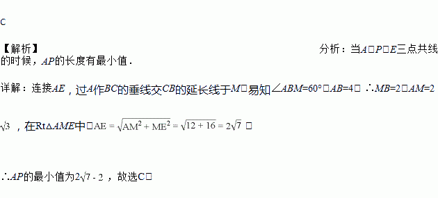 如图,在菱形ABCD中,点E是BC边的中点,动点M在CD边上运动,以EM为折痕将△CEM折叠得到△PEM,联接PA,若AB=4,∠BAD=60°,则PA的最小值是( )