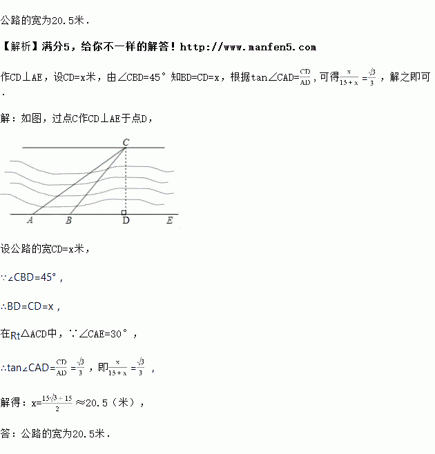 如图,一条公路的两侧互相平行,某课外兴趣小组在公路一侧AE的点A处测得公路对面的点C与AE的夹角∠CAE=30°,沿着AE方向前进15米到点B处测得∠CBE=45°,求公路的宽度.(结果精确到0.1米,参考数据: