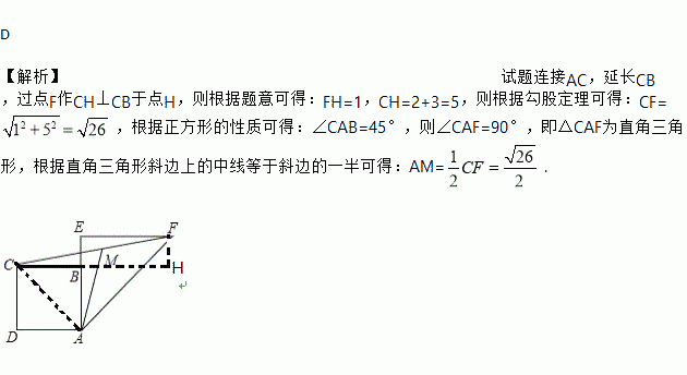 如图,在正方形ABCD中,AB=2,延长AB至点E,使得BE=1,EF⊥AE,EF=AE.分别连接AF,CF,M为CF的中点,则AM的长为( )