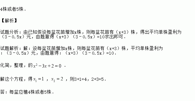 某花圃用花盆培育某种花苗,经过实验发现每盆的盈利与每盆的株数构成一定的关系.每盆植入3株时,平均单株盈利3元;以同样的栽培条件,若每盆增加1株,平均单株盈利就减少0.5元.要使每盆的盈利达到10元,每盆应该植多少株?