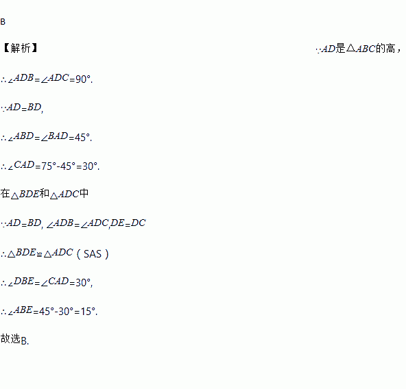 如图,AD是△ABC的高,AD=BD,DE=DC,∠BAC=75°,则∠ABE的度数是( )