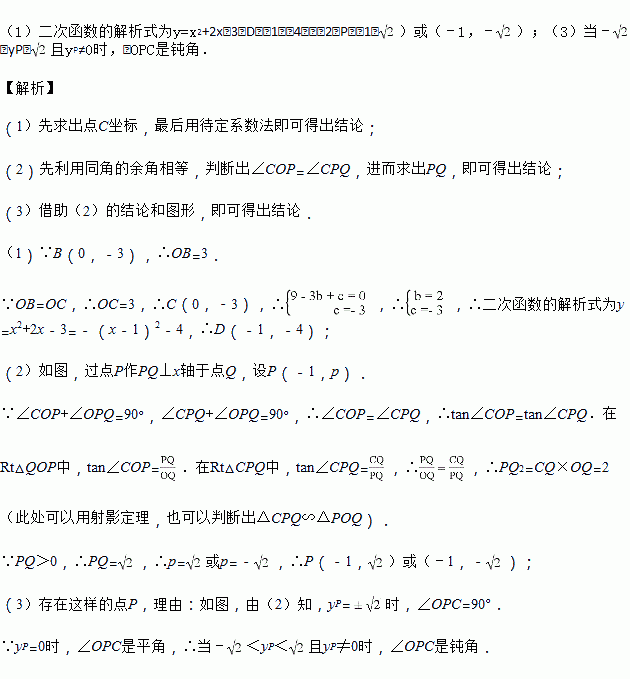 (3)在对称轴上是否存在一点P,使得∠OPC为钝角,若存在,请直接写出点P的纵坐标为yp的取值范围,若没有,请说明理由.