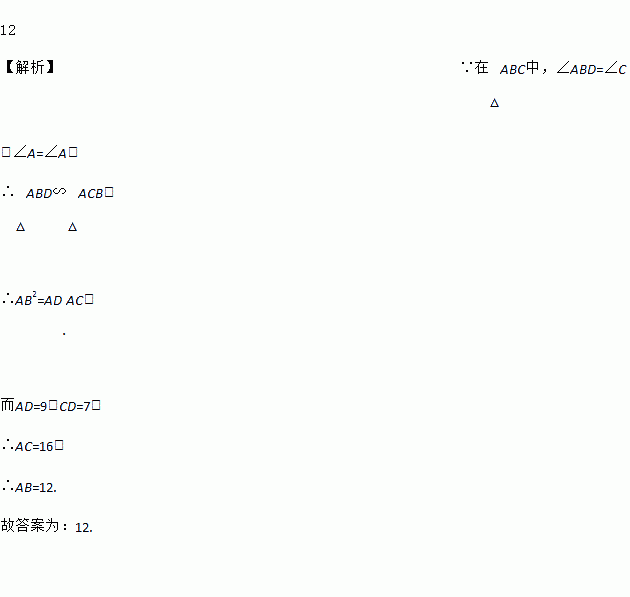 如图,△ABC中,点D在边AC上,∠ABD=∠C,AD=9,DC=7,那么AB=______.